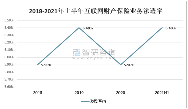2018-2021年上半年互聯網財產保險業務滲透率呈現一定的波動性,2021年上半年互聯網財產保險業務滲透率由2020年的5.9%上升至6.4%,與2019年持平。