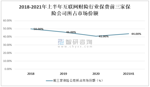 智研咨詢發布的《2021-2027年中國財產保險行業市場運行格局及發展趨勢研究報告》數據顯示:截至2021年6月末,互聯網財產保險行業保費前三家保險公司所占市場份額為44%,較2020年年底提升3個百分點。