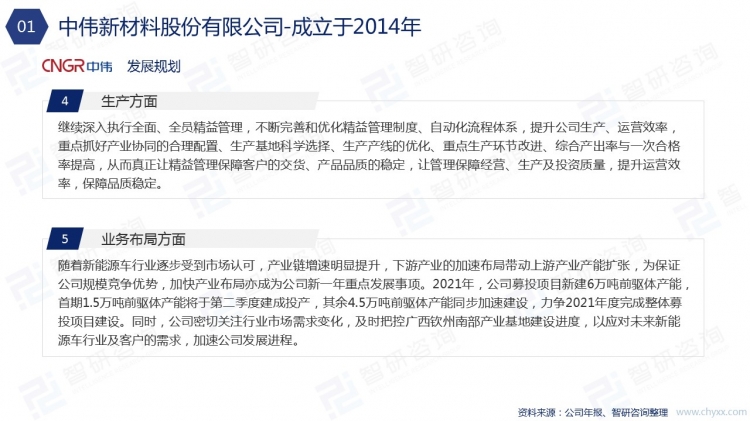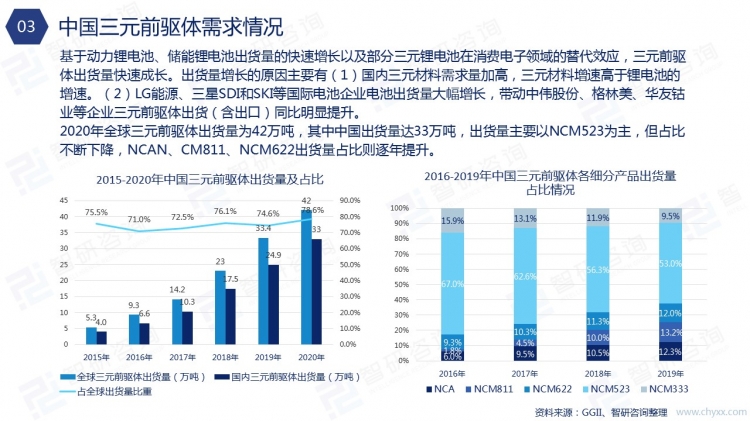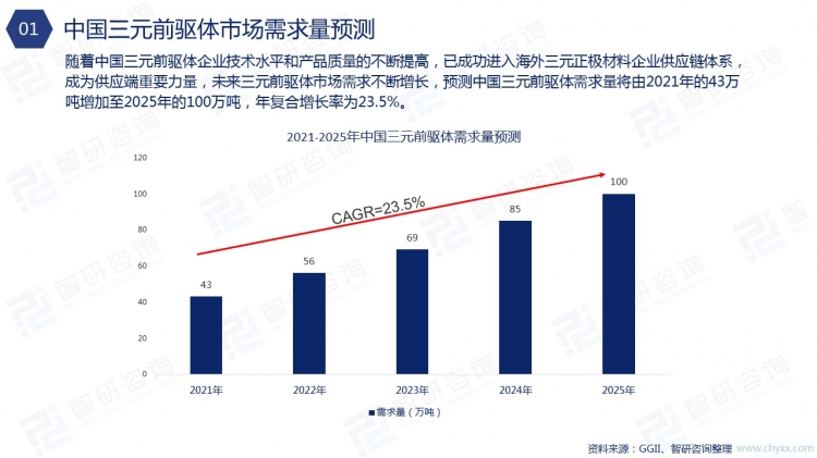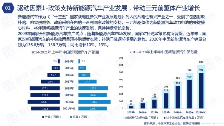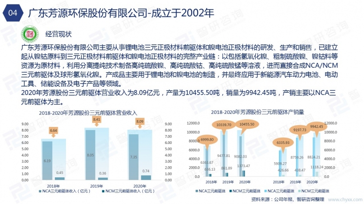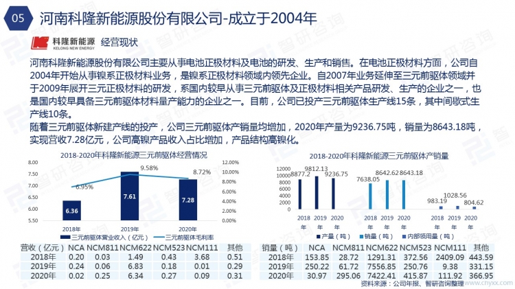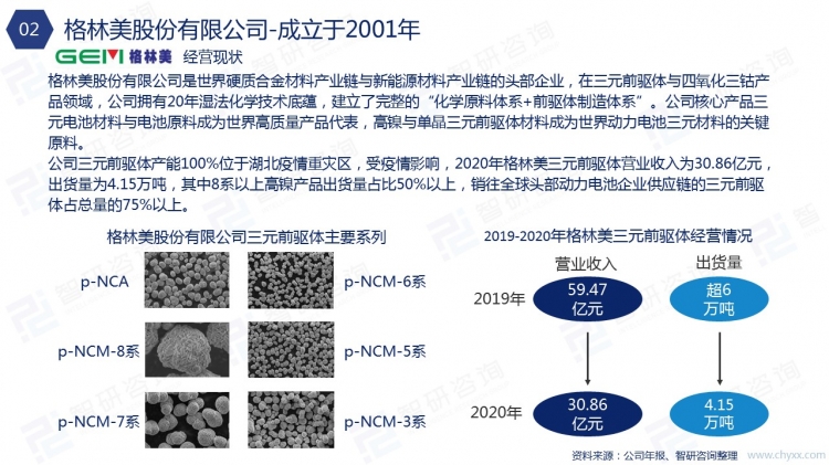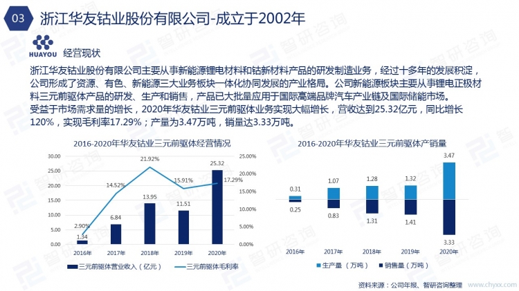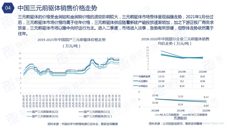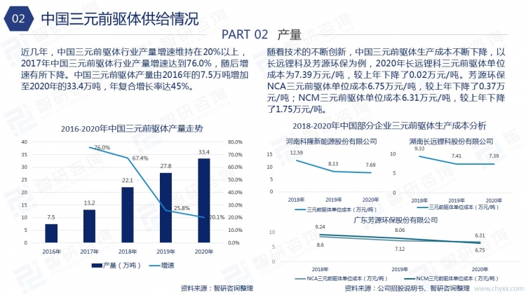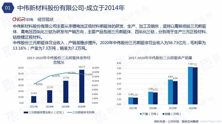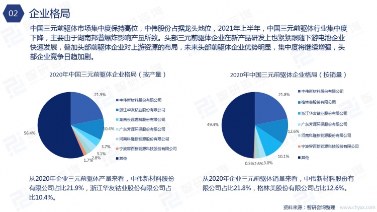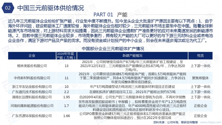 三元前驅體是指不同鎳鈷錳元素配比的鎳鈷錳氫氧化物,是三元正極材料生產過程中的主要中間品和主要原材料,與三元正極材料的市場情況緊密相關。在新能源汽車、3C產品、儲能市場快速發展驅動下,三元前驅體出貨量不斷增加,出貨量由2016年的6.6萬噸增加至2020年的33萬噸,為應對市場需求增長,三元前驅體頭部企業紛紛擴張產能,在新產品研發上也緊緊跟隨下游電池企業快速發展,疊加頭部三元前驅體企業對上游資源的布局,未來頭部前驅體企業優勢明顯,集中度將繼續增強,頭部企業競爭日趨加劇。
