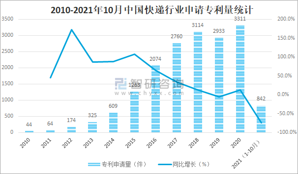 2010-2021年10月中國(guó)快遞行業(yè)申請(qǐng)專利量統(tǒng)計(jì)
