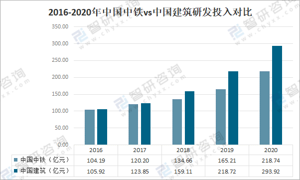 2016-2020年中國中鐵vs中國建筑研發投入對比