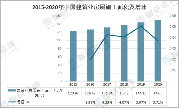 智研咨詢發布的《2022-2028年中國建筑業行業市場運行格局及戰略咨詢研究報告》數據顯示:近年來,我國建筑業總產值和房屋施工面積均保持較快增速,建筑業房屋施工面積整體呈上升趨勢。截至到2020年底,中國建筑業房屋施工面積149.5億平方米,較上年增加5.35億平方米,同比增長3.71%。