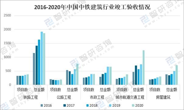 中國中鐵竣工驗收情況來看,2020年,中國中鐵鐵路工程項目數383個,總金額1867.0億元;公路工程項目數192個,總金額763.9億元;市政工程項目數389個,總金額656.9億元;城市軌道交通工程項目數380個,總金額1,249.0億元;房屋建筑項目數310個,總金額709.9億元。