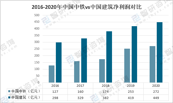 從凈利潤來看,2020年,中國中鐵實現凈利潤 272億元,較上年增加19億元,同比增長7.37%;中國建筑實現凈利潤449億元,較上年增加30億元,同比增長7.3%。