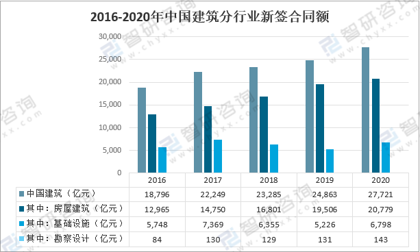 中國建筑業務類型中,2020年,中國建筑累計新簽合同額27721億元,較上年增加2858億元,同比增長11.5%;其中,房屋建筑新簽合同額20779億元,同比增長6.5%;基礎設施新簽合同額6798億元,同比增長30.1%;勘察設計新簽合同額143億元,同比增長9.1%。