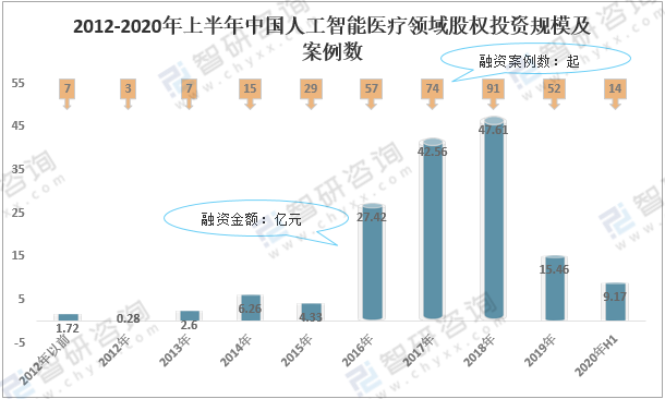 2012-2020年上半年中國人工智能醫療領域股權投資規模及案例數
