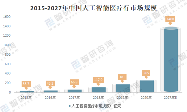 2015-2027年中國人工智能醫療行市場規模