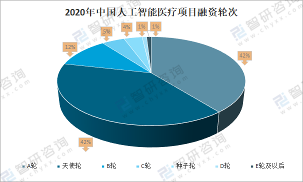 2020年中國人工智能醫療項目中A輪融資占42%;天使輪融資占42%;B輪融資占12%;C輪融資占5%;種子輪融資占4%;D輪融資、E輪及以后融資各占1%。