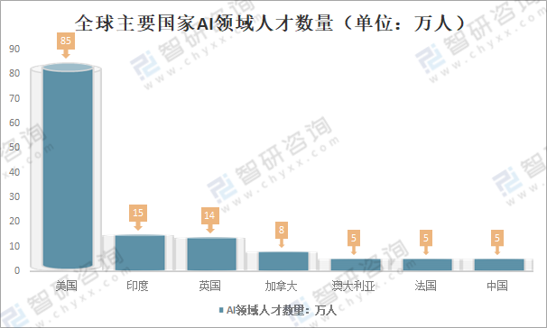 在人工智能領域競爭的眾多關鍵要素中,人才獲取和團隊建設已經成為最具挑戰性的部分之一。美國在AI領域人才數量20萬人;印度在AI領域人才數量15萬人;英國在AI領域人才數量14萬人;加拿大在AI領域人才數量:8萬人;澳大利亞、法國、中國在AI領域人才數量各5萬人。可以說,在人工智能領域競爭的眾多關鍵要素中,人才獲取和團隊建設已經成為最具挑戰性的部分之一,根據工信部調研數據,我國AI產業發展與人才需求比為1:10,AI人才缺口較大。
