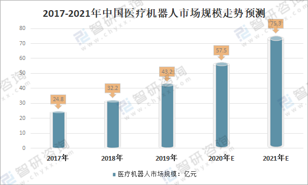 醫療機器人為人工智能醫療主要應用場景之一,各種不同功能的醫療機器人均已得到應用。但我國醫療機器人市場普及率處在較低,2019年中國醫療機器人市場規模43.2億元,較2018年增長11億元;2020年中國醫療機器人市場規模約57.5億元;預計2021年中國醫療機器人市場規模75.3億元。