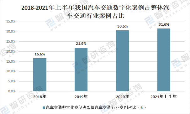 2018-2021年上半年我國汽車交通數字化案例占整體汽車交通行業案例占比