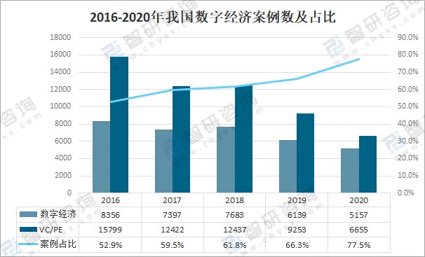 2016年,數字經濟相關的投資案例事件數為8356起,到2020年投資案例數因為大環境的影響下降到5157起,平均每年下滑10.9%;VC/PE市場整體案例數從2016年的15799起下降到2020年的6655起,平均每年下滑18.7%;2016年,數字經濟的案例數占比為52.9%,到2020年數字經濟案例數比例上升到77.5%。