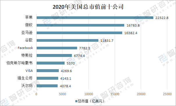 2020年,全球經濟增速在疫情影響下呈現負增長,全年下降4.4%。從個股來看,美股市值排在前十的個股包含蘋果、微軟、亞馬遜、谷歌、Facebook、特斯拉、強生公司等科技公司,其中,蘋果的市值高達22322.8億美元,微軟總市值16783.8億美元,亞馬遜總市值16382.4億美元。