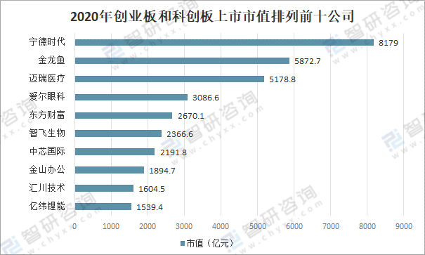 2020年創業板和科創板上市市值排列前十公司