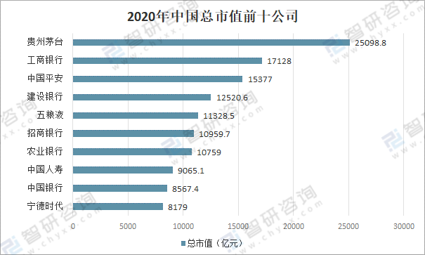 2020年中國GDP首次超過100萬億元,達到101.6萬億元,同比增長2.3%。從A股來看,市值排在前十的個股包含貴州茅臺、工商銀行、中國平安、建設銀行、五糧液、招商銀行、農業銀行、中國人壽、中國銀行等,其中,貴州茅臺總市值25098.8億元,工商銀行總市值17128億元,中國平安總市值15377億元。