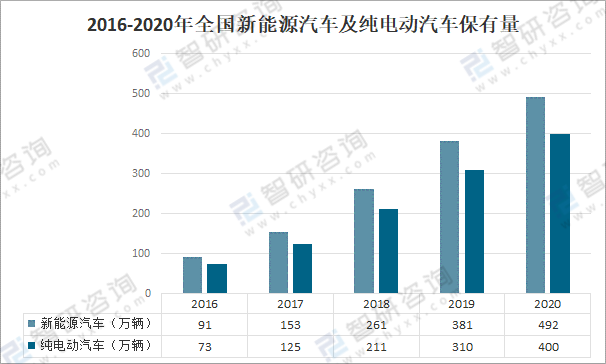 2020年,全國(guó)新能源汽車保有量達(dá)492萬輛,比2019年增加111萬輛,同比增長(zhǎng)29.18%。其中,純電動(dòng)汽車保有量400萬輛,比2019年增加90萬輛,同比增長(zhǎng)29.03%;新能源巡游出租車13.2萬輛,新能源公交車46.6萬輛,新能源汽車增量連續(xù)三年超過100萬輛,呈持續(xù)高速增長(zhǎng)趨勢(shì)。