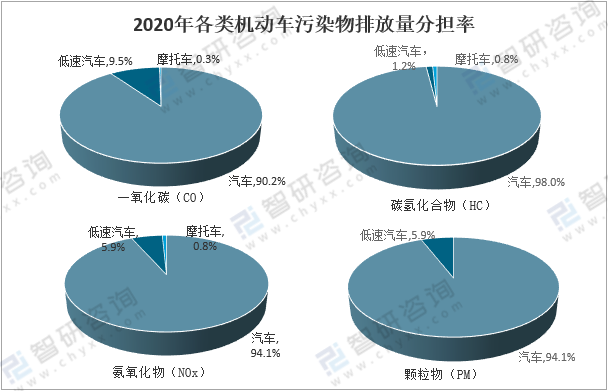 2020年,全國(guó)機(jī)動(dòng)車四項(xiàng)污染物排放總量為1593.0萬噸;其中一氧化碳(CO)、碳?xì)浠衔铮℉C)、氮氧化物(NOx)、顆粒物(PM)排放量分別為769.7萬噸、190.2萬噸、626.3萬噸、6.8萬噸。其中,汽車、低速汽車、摩托車一氧化碳(CO)排放量分別占90.2%、0.3%、9.5%;汽車、低速汽車、摩托車碳?xì)浠衔铮℉C)排放量占 90.6%、1.2%、8.2%;汽車、低速汽車、摩托車氮氧化物(NOx)排放量分別占 98.0%、1.2%、0.2%;汽車、低速汽車顆粒物(PM)排放量分別占94.1%、5.9%。