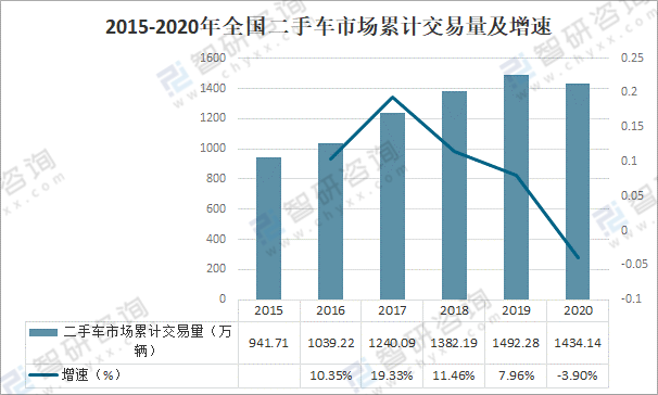 2015-2020年全國(guó)二手車市場(chǎng)累計(jì)交易量及增速