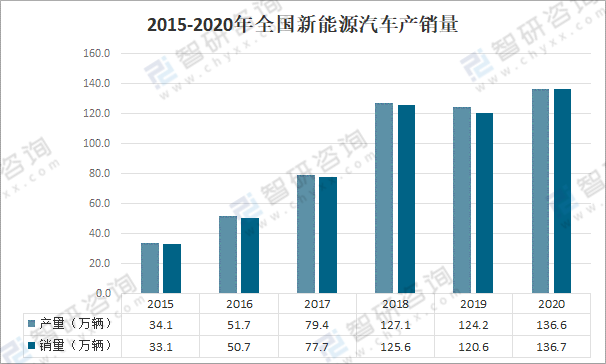 2020年,全國(guó)新能源汽車產(chǎn)銷量分別為136.6萬輛和136.7萬輛,其中純電動(dòng)汽車產(chǎn)銷量分別為110.5萬輛和111.5萬輛;插電式混合動(dòng)力汽車產(chǎn)銷量分別為26.0萬輛和25.1萬輛。
