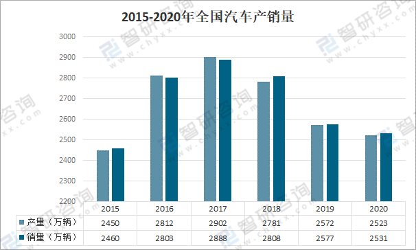 2015-2020年全國(guó)汽車產(chǎn)銷量