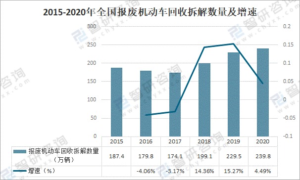 2015-2020年全國(guó)報(bào)廢機(jī)動(dòng)車回收拆解數(shù)量及增速