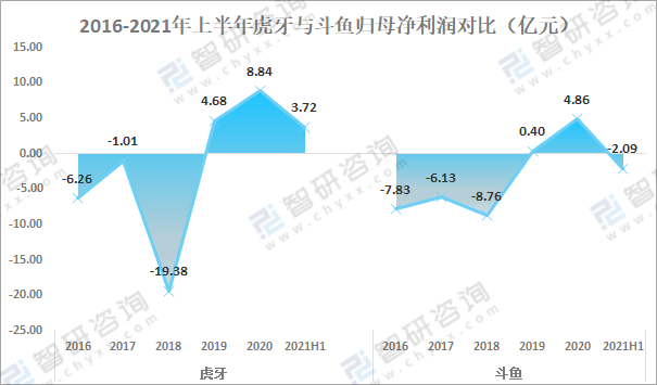2016-2021年上半年虎牙與斗魚歸母凈利潤對比(億元)