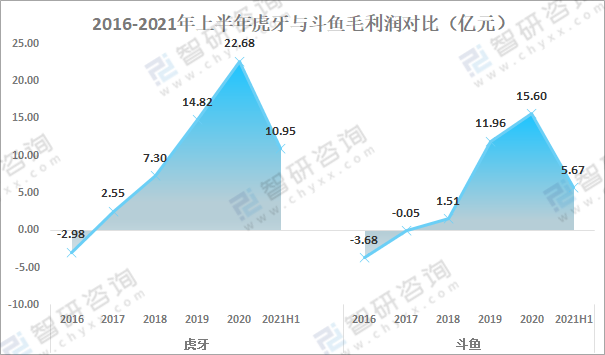 隨著營業(yè)收入的增加,毛利潤也隨之增長,2020年虎牙毛利潤達(dá)22.68億元,較2019年增加了7.86億元,2021年上半年虎牙毛利潤為10.95億元。2020年斗魚毛利潤達(dá)15.60億元,較2019年增加了3.64億元,2021年上半年斗魚毛利潤為5.67億元。