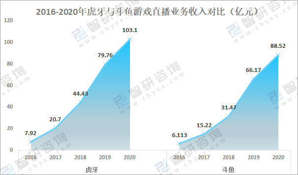 從游戲直播業(yè)務(wù)收入來看,2020年虎牙和斗魚游戲直播業(yè)務(wù)收入增幅明顯。2020年虎牙游戲直播業(yè)務(wù)收入達(dá)103.1億元,較2019年增加了23.34億元;斗魚游戲直播業(yè)務(wù)收入達(dá)88.52億元,較2019年增加了22.35億元。