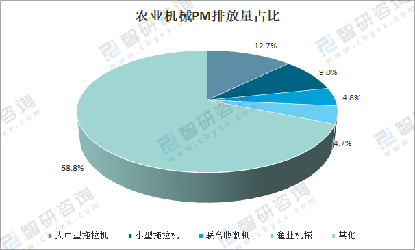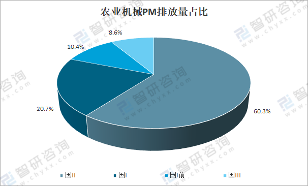 按排放標準劃分,國Ⅱ標準的農業機械排放顆粒物(PM)為 5.5萬噸,占比60.3%;國Ⅰ標準的農業機械排放顆粒物(PM)為1.9萬噸,占比20.7%;國Ⅰ前標準的農業機械排放顆粒物(PM)為1.0萬噸,占比10.4%;國Ⅲ標準的農業機械排放顆粒物(PM)為0.8萬噸,占比8.6%。