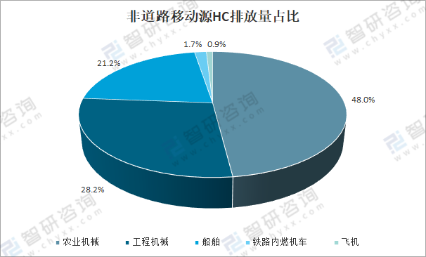 2020年,非道路移動源排放碳氫化合物(HC)為42.5萬噸。其中,農業機械排放的碳氫化合物(HC)占非道路移動源排放總量的48%,工程機械排放的碳氫化合物(HC)占非道路移動源排放總量的28.2%,船舶排放的碳氫化合物(HC)占非道路移動源排放總量的21.2%,鐵路內燃機車排放的碳氫化合物(HC)占非道路移動源排放總量的1.7%,飛機排放的碳氫化合物(HC)占非道路移動源排放總量的0.9%。