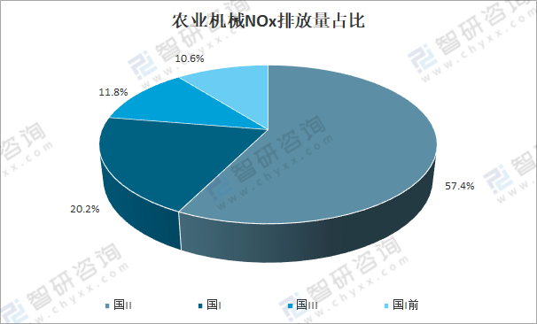 按排放標準劃分,國Ⅱ標準的農業機械排放氮氧化物(NOx)為 95.9萬噸,占比57.4%;國Ⅰ標準的農業機械排放氮氧化物(NOx)為33.8萬噸,占比20.2%;國Ⅲ標準的農業機械排放氮氧化物(NOx)為19.6萬噸,占比11.8%;國Ⅰ前標準的農業機械排放氮氧化物(NOx)為17.7萬噸,占比10.6%。