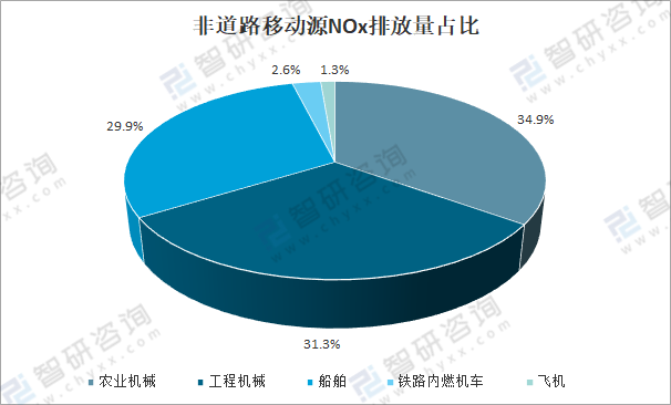 2020年,非道路移動源排放氮氧化物(NOx)478.2萬噸。其中,農業機械排放的氮氧化物(NOx)占非道路移動源排放總量的34.9%,工程機械排放的氮氧化物(NOx)占非道路移動源排放總量的31.3%,船舶排放的氮氧化物(NOx)占非道路移動源排放總量的29.9%,鐵路內燃機車排放的氮氧化物(NOx)占非道路移動源排放總量的2.6%,飛機排放的氮氧化物(NOx)占非道路移動源排放總量的1.3%。