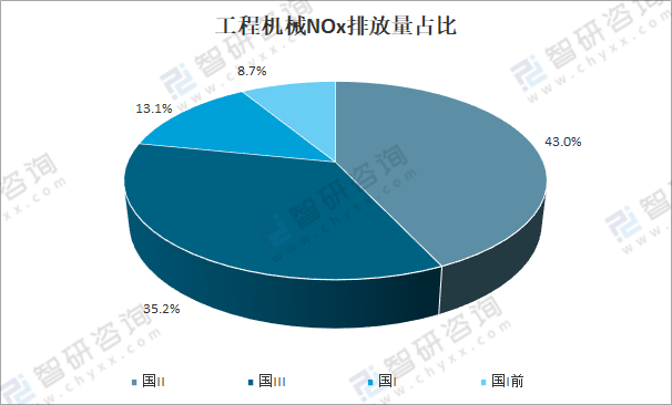 按排放標準劃分,國Ⅱ標準的工程機械排放氮氧化物(NOx)為64.4萬噸,占比43%;國Ⅲ標準的工程機械排放氮氧化物(NOx)為52.7萬噸,占比35.2%;國Ⅰ標準的工程機械排放氮氧化物(NOx)為19.7萬噸,占比13.1%;國Ⅰ前標準的工程機械排放氮氧化物(NOx)為13.1萬噸,占比8.7%。