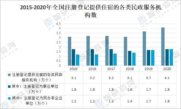 截至2020年底,全國注冊登記提供住宿的各類民政服務機構共計4.1萬個,較上年增加0.4萬個,同比增長10.81%;其中注冊登記為事業單位的1.8萬個,占民政服務機構的43.90%;注冊登記為民辦非企業單位的1.8萬個,占民政服務機構的43.90%。