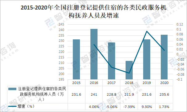 各類民政服務機構進一步完善應急預案,充實物資儲備,確保服務對象的人身安全和基本生活。截至2020年底,全國年末注冊登記提供住宿的各類民政服務機構撫養人員235.6萬人,較上年增加4.0萬人,同比增長1.73%。