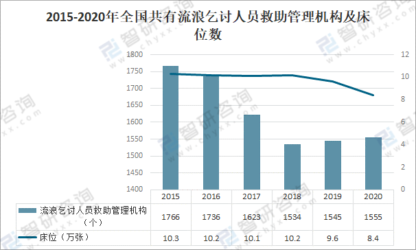 2015-2020年全國共有流浪乞討人員救助管理機構及床位數