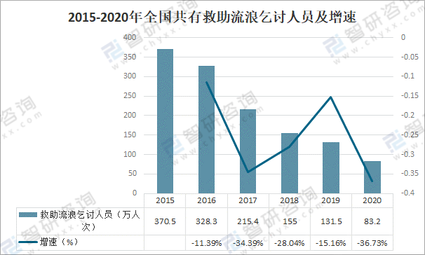 2015-2020年全國共有救助流浪乞討人員及增速