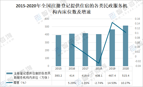 2015-2020年全國注冊登記提供住宿的各類民政服務機構內床位數及增速