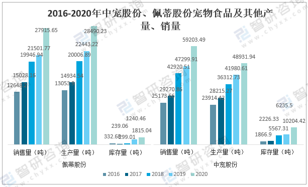 2016-2020年中寵股份、佩蒂股份寵物食品及其他產量、銷量