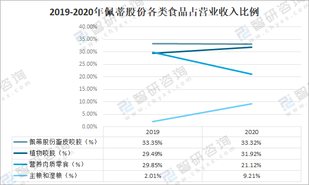 2020年佩蒂股份寵物營業收入比例中,2020年畜皮咬膠占營業收入的33.32%;植物咬膠占營業收入的31.92%;營養肉質零食占營業收入的21.12%;主糧和濕糧占營業收入的9.21%。