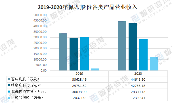 其中2020年佩蒂股份畜皮咬膠營業收入為44643.3萬元,同比增長32.8%;植物咬膠營業收入為42766.18萬元,同比增長43.8%;營養肉質零食營業收入為28300.13萬元,同比下降6%;主糧和濕糧營業收入為12339.41萬元,同比增長507.2%。