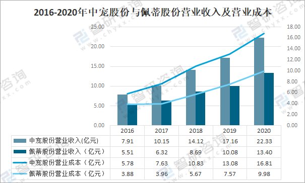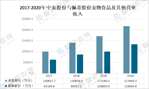 其中2020年中寵股份寵物食品及其他營業收入為217966.4萬元,同比增長27.3%;佩蒂股份寵物食品及其他營業收入為133984.8萬元,同比增長32.9%。