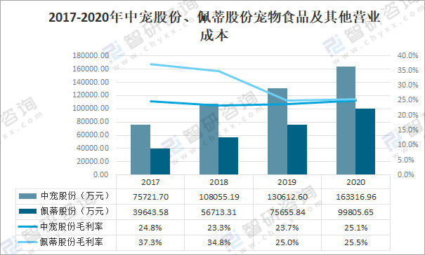 2020年中寵股份寵物食品及其他營業成本為163316.96萬元,同比增長25%,毛利率為25.1%;佩蒂股份寵物食品及其他營業成本為99805.65萬元,同比增長31.9%,毛利率為25.5%。