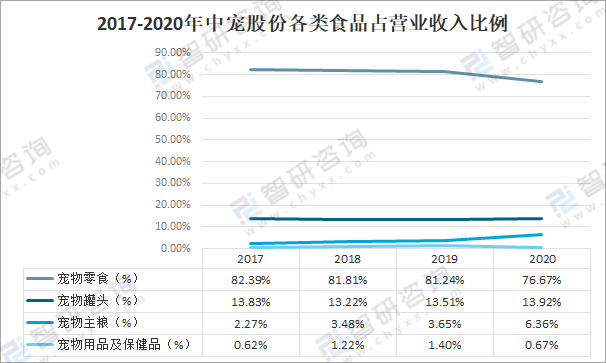 2017-2020年中寵股份各類食品占營業收入比例