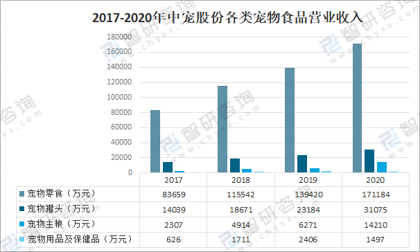其中2020年中寵股份寵物零食營業收入為171184萬元,同比增長22.8%;寵物罐頭營業收入為31075萬元,同比增長34%;寵物主糧營業收入為14210萬元,同比增長126.6%;寵物用品及保健品營業收入為1497萬元,同比下降37.8%。