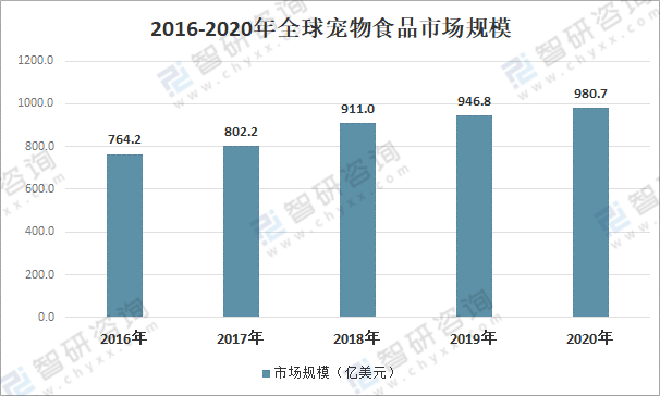 在過(guò)去的幾年中,全球?qū)櫸锸称肥袌?chǎng)平穩(wěn)持續(xù)增長(zhǎng),主要受益于南非等一些新興的市場(chǎng)發(fā)展迅速,2020年全球?qū)櫸锸称肥袌?chǎng)規(guī)模為980.7億美元,較2019年的946.8億美元同比增長(zhǎng)3.6%。全球?qū)櫸锸称肥袌?chǎng)基本被瑪氏、雀巢等幾家大企業(yè)所壟斷。