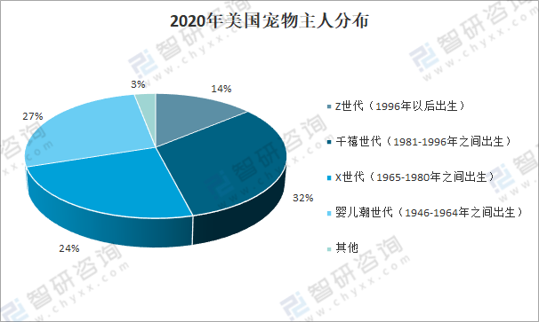 千禧世代和嬰兒潮世代為美國(guó)養(yǎng)寵物主力軍,從2020年美國(guó)寵物主人分布來(lái)看,千禧世代占比32%,嬰兒潮世代占比27%,X世代占比24%。