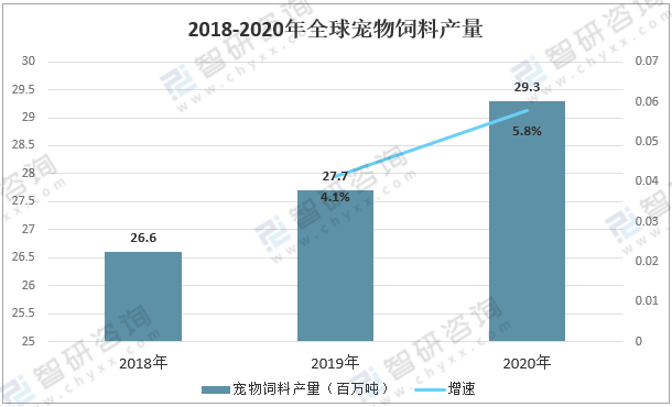全球?qū)櫸锸袌?chǎng)已逐步成熟,寵物食品作為寵物行業(yè)的一個(gè)重要分支,是寵物市場(chǎng)最大的“蛋糕”,全球?qū)櫸锸称肥袌?chǎng)占整個(gè)寵物行業(yè)的比重逐年增加。2020年全球?qū)櫸镲暳袭a(chǎn)量為29.3百萬(wàn)噸,較2019年的27.7百萬(wàn)噸同比增長(zhǎng)5.8%。