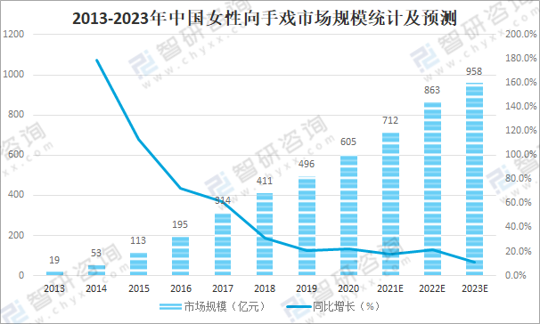 2013-2023年中國女性向手戲市場規模統計及預測