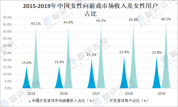 近年來中國女性游戲用戶占比逐年攀升,2019年中國女性游戲用戶占比達46.2%,較2018年增長了0.4%,而女性游戲市場銷售收入占比達22.8%。